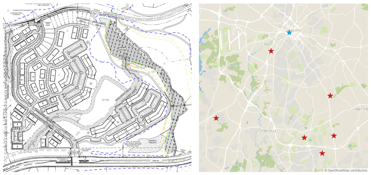 Site plan for the controversial Gillespie rezoning in Piper Glen (left); map of The Ledgerās selections of the six hottest rezoning sites, with three close to the Providence Road corridor