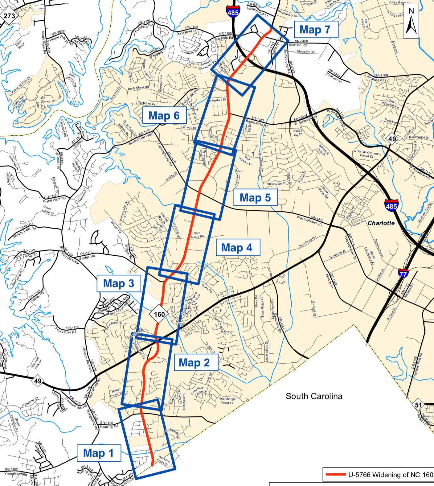 The widening of a 7-mile stretch of N.C. 160 in Steele Creek, from the state line to inside I-485, is projected to start construction in 2028. (Map from N.C. Department of Transportation)