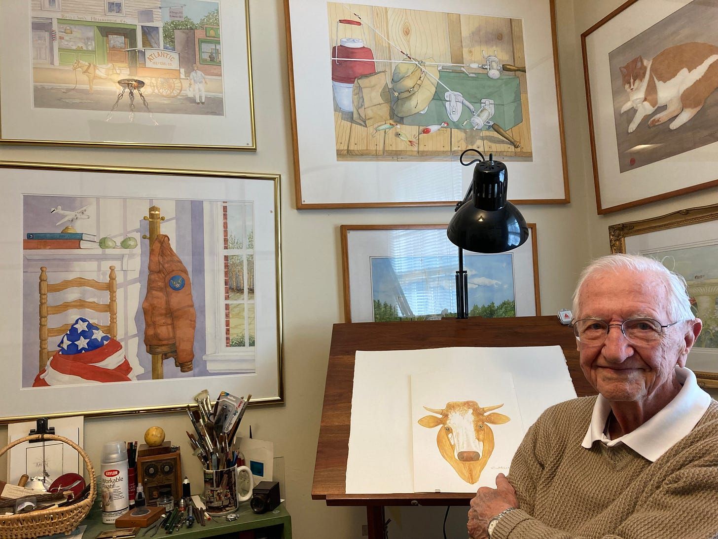Charlie Mills took up painting in his retirement. Here he sits in front of some of his watercolors.