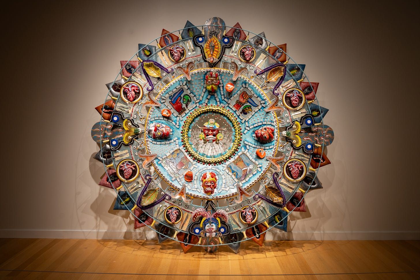 “Oxymodern: Aztec Calendar,” the large circular piece at the entrance, introduces you to almost everything the brothers are about. Blown glass and mixed media delve into Mesoamerican symbolism, riff on our modern throwaway lifestyle, lampoon unrestricted capitalism, insert hidden sexual and genetic meanings and serve as a channel for any images that popped into the brothers’ craniums. (I say “almost” because they also work with lenticular printing, which gives the illusion of depth and changes when viewed from different angles.)