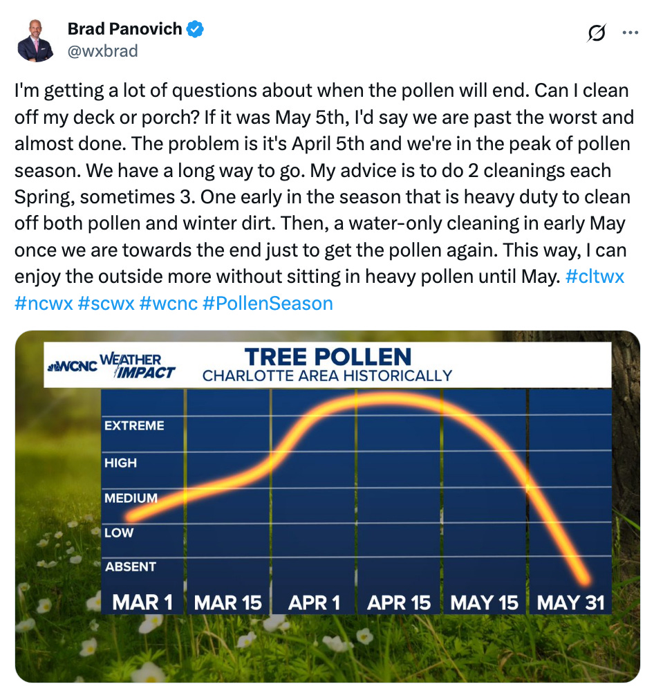 WCNC chief meteorologist Brad Panovich, writing on X (formerly Twitter) over the weekend, about how long pollen in Charlotte will last, and how to clean decks and porches:
