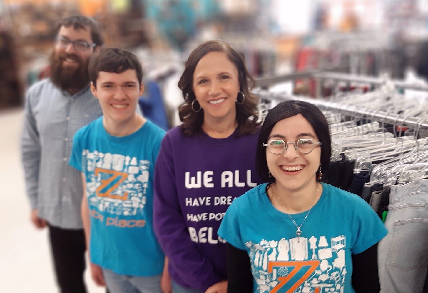 A REWARDING MISSION: Bentzion Groner (far left) and Rochel Groner (far right) are directors of ZABS Place, which trains young people with special needs through roles in a thrift boutique and furniture store. Cole Levy (second from left) and his mom, Ami Levy, (second from right) have found the program to be a great way for Cole, who has autism, to build his confidence and independence.