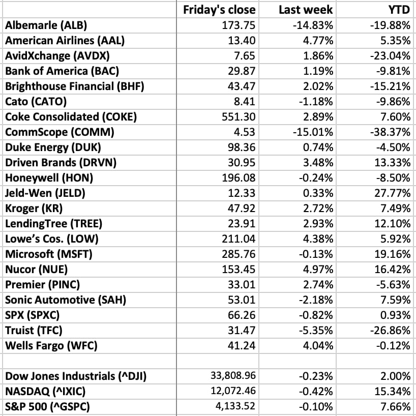 Unless you are a day trader, checking your stocks daily is unhealthy. So how about weekly? How local stocks of note fared last week (through Friday’s close), and year to date: