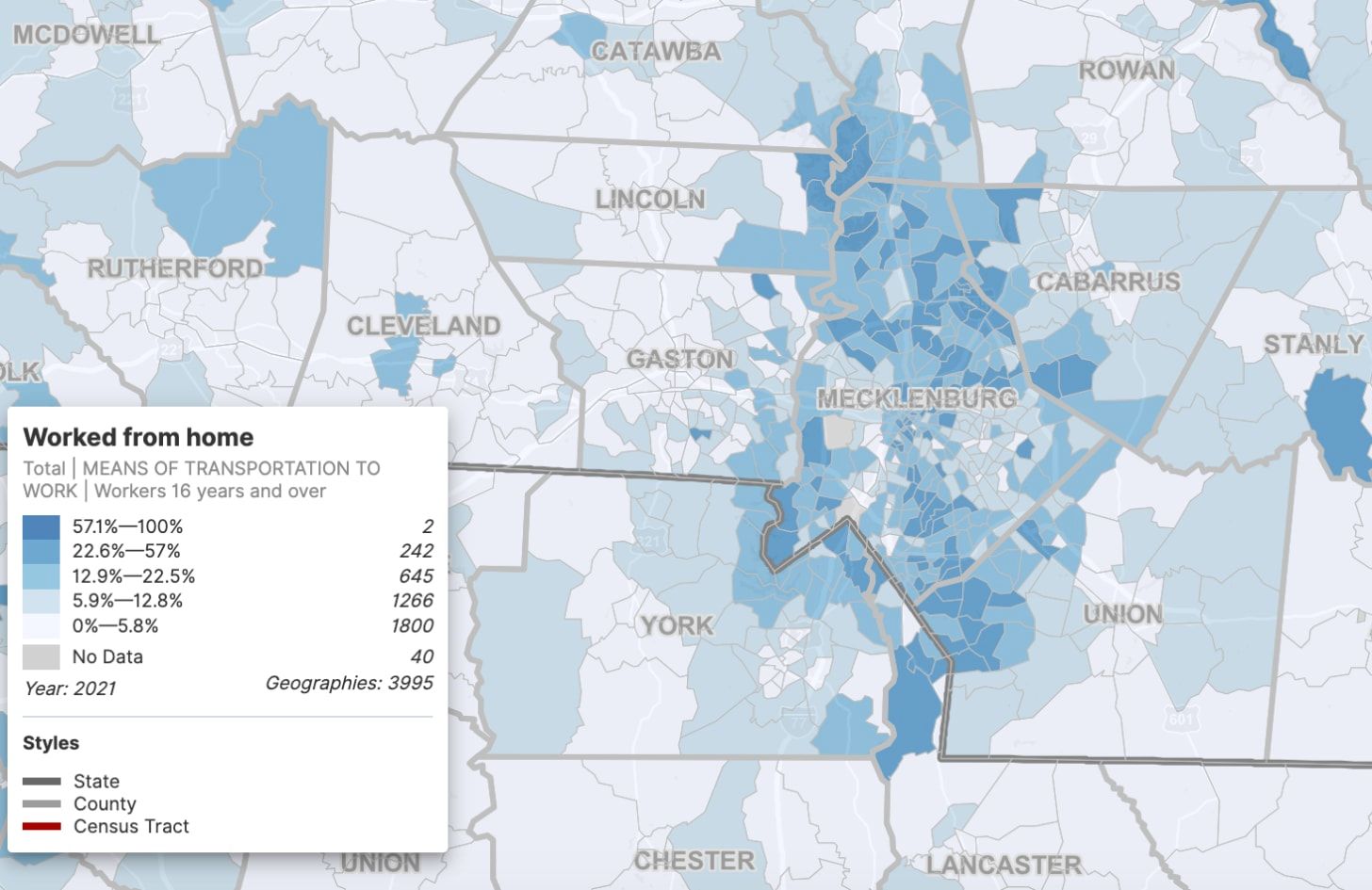 In the Charlotte region, working from home is mostly a Mecklenburg County phenomenon.