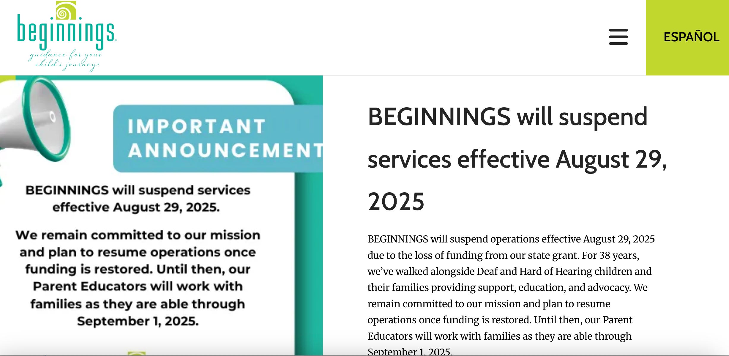 The website of Beginnings for Parents of Children who are Deaf or Hard of Hearing says it is suspending services.