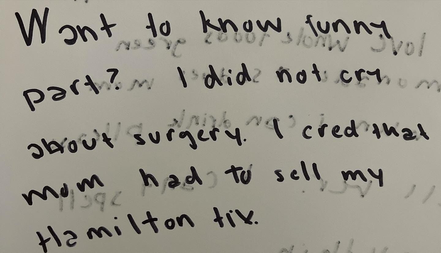 She had to write to communicate with her parents and medical staff, and although she now knows it doesn’t make rational sense given the condition her body was in, she was grieving something very specific: missing “Hamilton.”