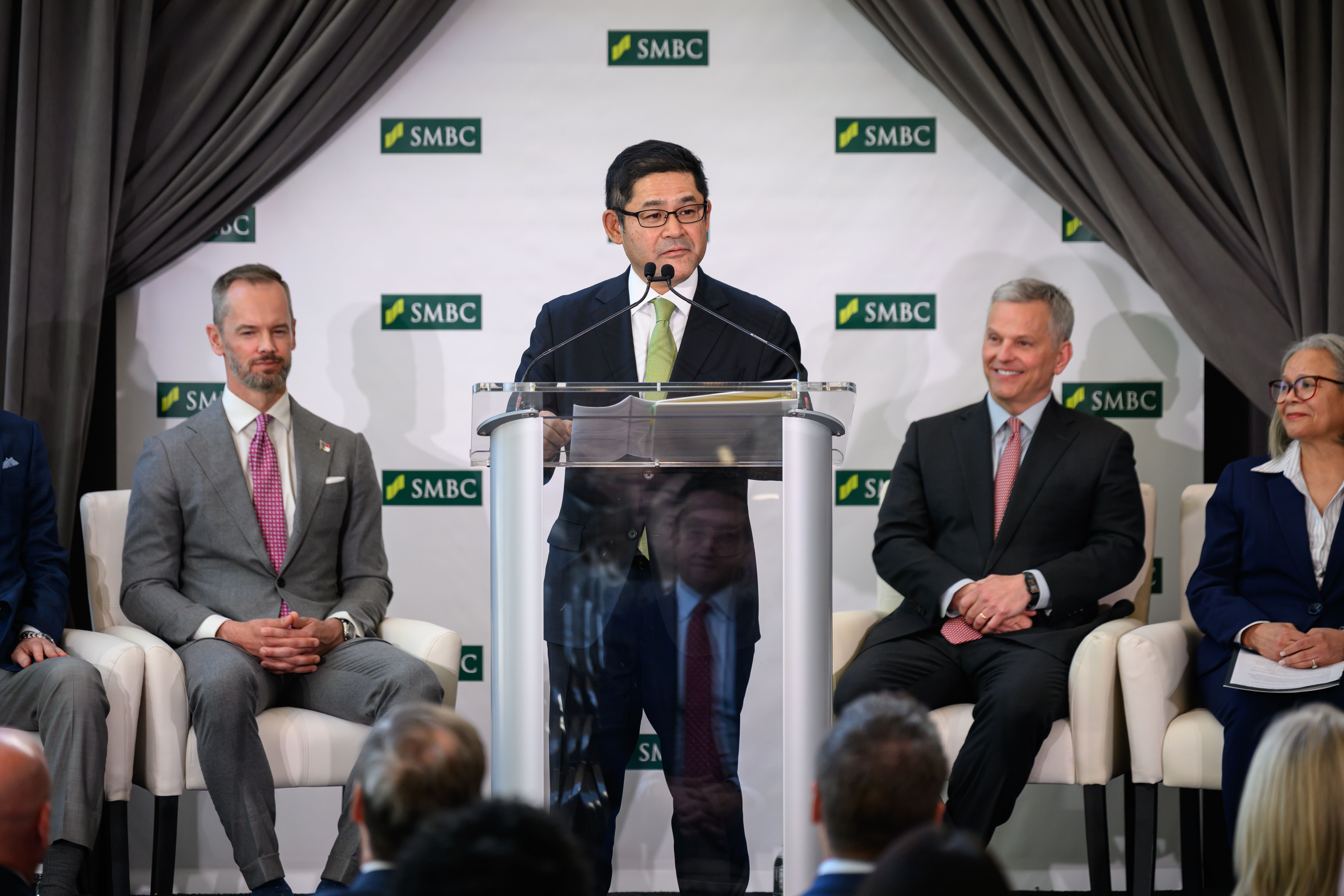 Hirofumi (Hiro) Otsuka, the CEO of Sumitomo Mitsui Banking Corp.’s Americas division, speaks at a news conference on April 7 at the Carolina Theatre in uptown. Officials who include, from left, Lee Lilly, the state’s commerce secretary; Gov. Josh Stein and Charlotte Mayor Vi Lyles were on hand for the announcement. (Photo courtesy of the city of Charlotte)