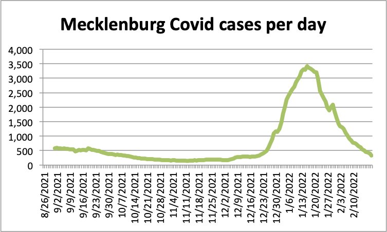 The 7-day average of Covid cases in Mecklenburg has been plunging since mid-January. (Source: N.C. Department of Health and Human Services)
