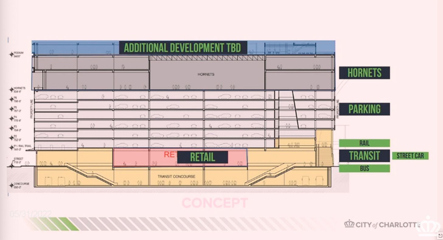 Below-ground transit, street level retail and above-ground parking and Hornets training center are the current plans for the bus station.