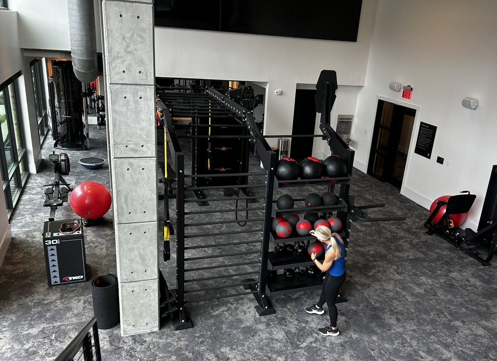 One of the gyms she’s recently designed and outfitted is in The Prospect, a new Greystar apartment community on South Mint Street in South End, where a 15-foot monkey bar bridge is flanked by an Olympic lift station and racks of weighted balls.