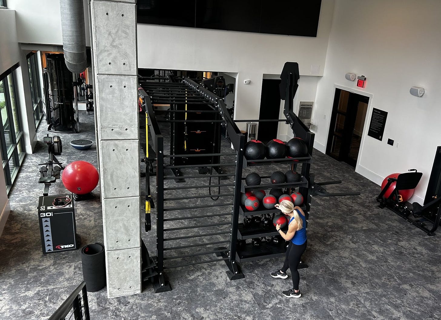 At The Prospect apartments on South Mint Street in South End, a portion of the extensive gym has a monkey bar bridge, an Olympic weight station, free weights, a smart mirror loaded with virtual classes and Crossfit-friendly equipment. The gym’s second level has a cardio area with Peleton-type bikes, treadmills and a window-lined group exercise room overlooking Bank of America Stadium. Here, Celia Smart adjusts equipment she ordered for the gym, which she designed.