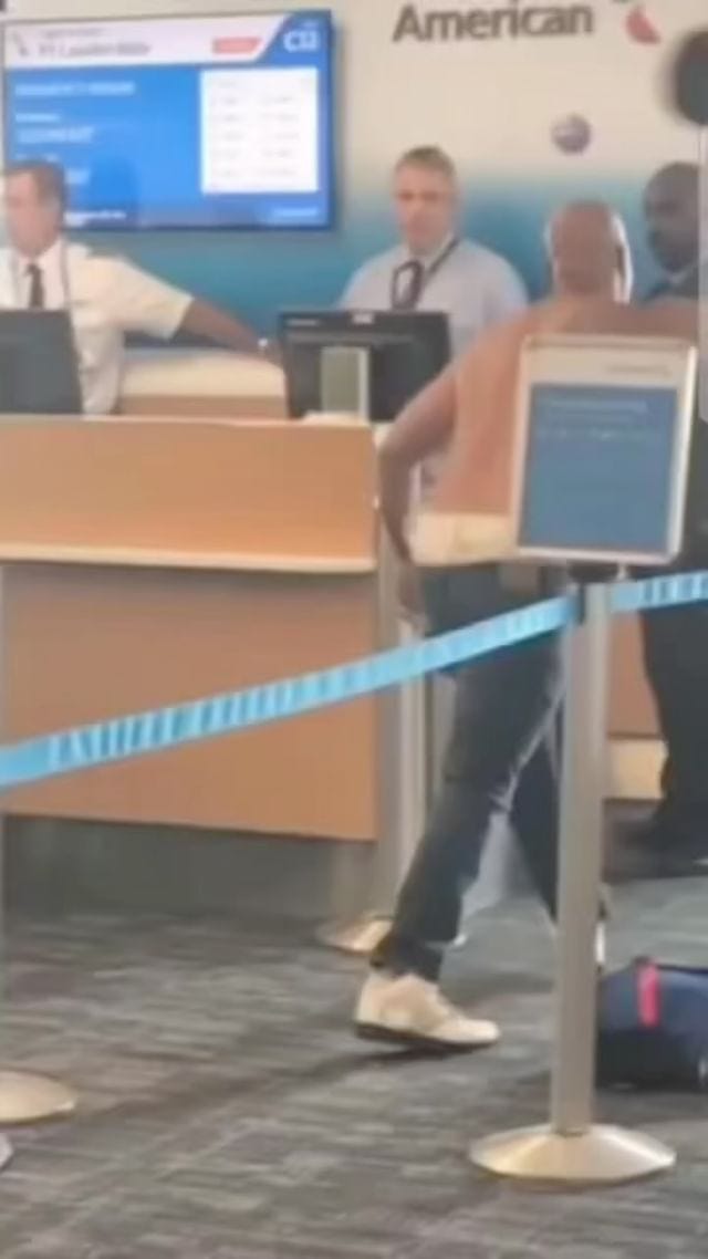 Another passenger shot video of the man, now shirtless and with pants hanging down below the top of his underwear, as he paced back and forth to the boarding door and began trashing the gate area. He toppled the sign where people line up in group numbers to board.