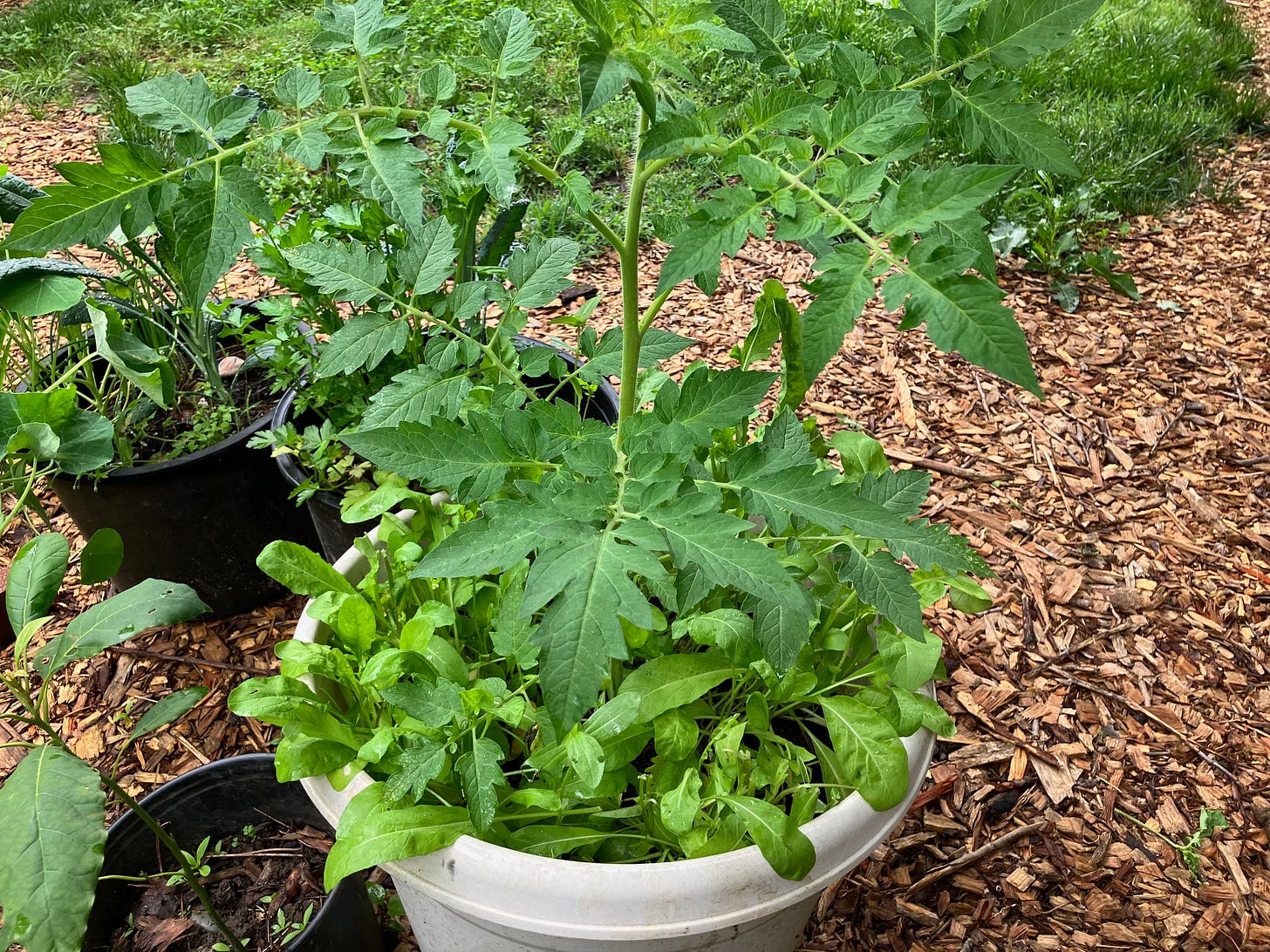 Save space by underplanting. Here, a tomato shares a pot with arugula. (Photo courtesy Amber Veverka)