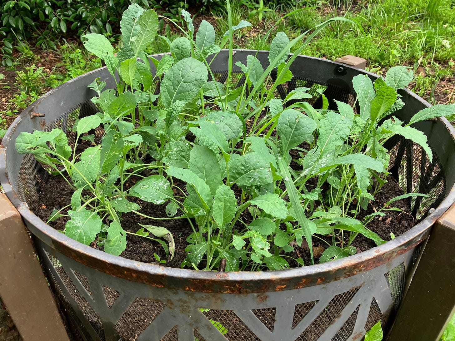 An old firepit makes a container for young kale and lemongrass. (Photo courtesy Amber Veverka)