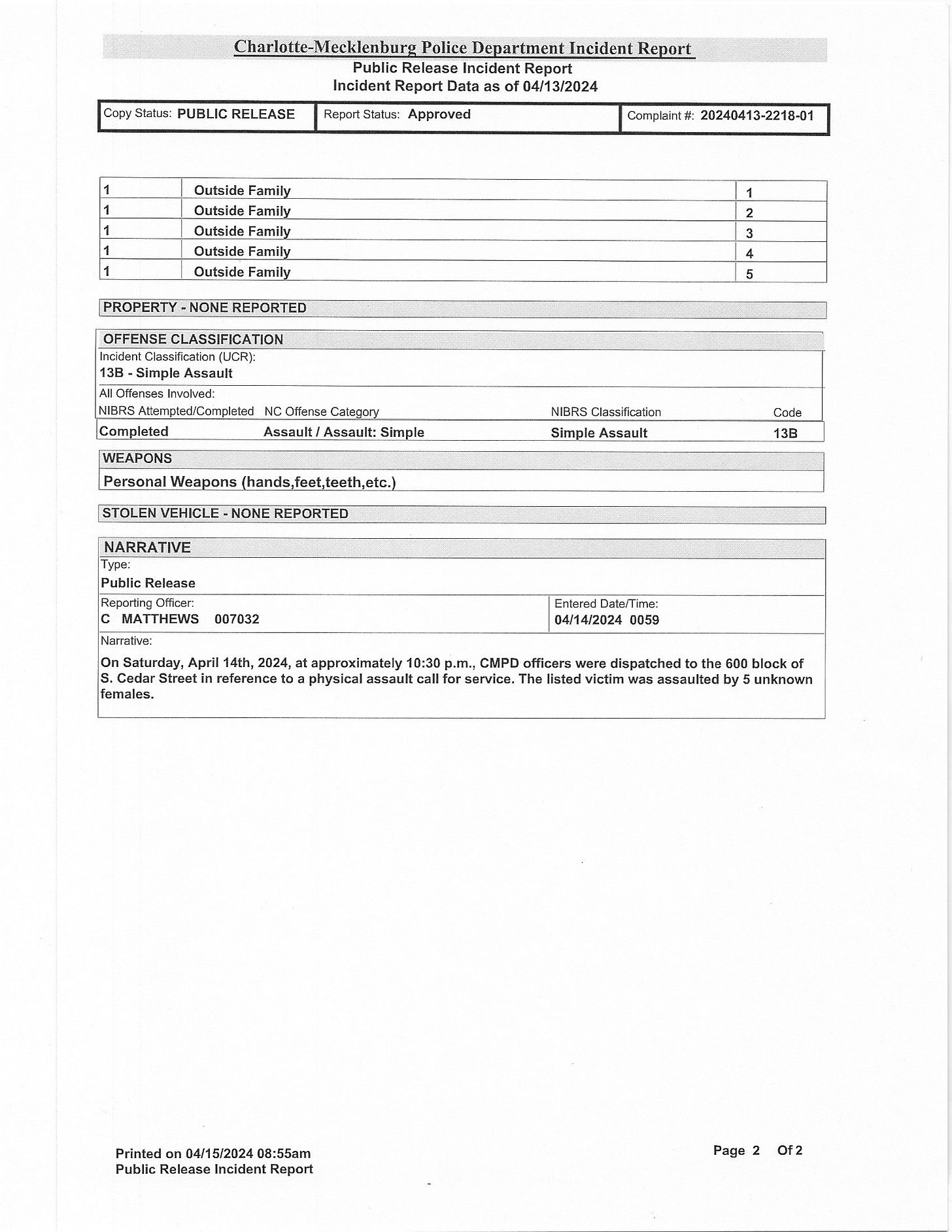 A police report obtained by The Ledger on Monday revealed little new information. It said that Gregory “was assaulted by 5 unknown females.” It did not name the five suspects in the public version of the report. [updated 4/15/24 at 9:45am to provide information from police report]