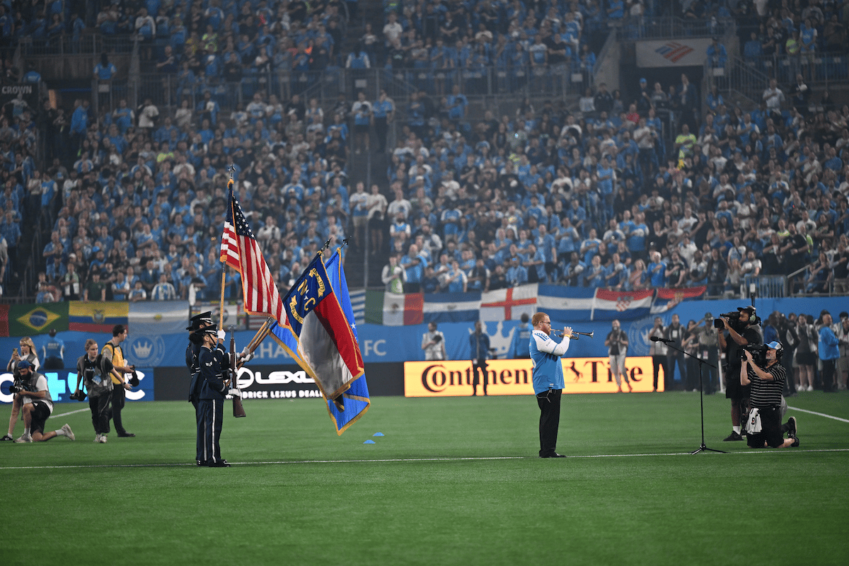 Drum borrowed the idea for a trumpeter from the Dallas Cowboys, who had trumpeter Freddie Jones playing the anthem for 13 years. Playing for Charlotte FC is Alex Wilborn, principal trumpeter for the Charlotte Symphony Orchestra and a native of Cookeville, Tenn. He’s been wearing a Charlotte FC kit that matches whatever the team is wearing that night.