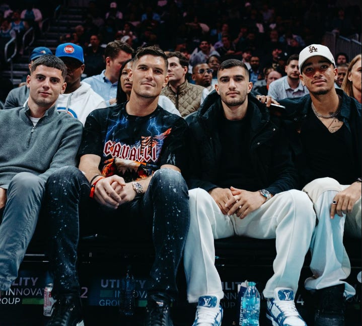 Four Charlotte FC players (from left) Nikola Petkovic, Kristijan Kahlina, Liel Abada and Idan Toklomati watched the Hornets defeat the Detroit Pistons on Wednesday night from courtside seats. (Photo courtesy of the Charlotte Hornets.)