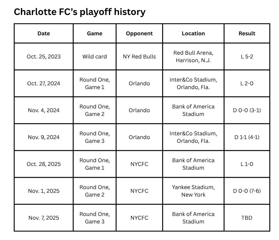 Charlotte hosts New York City FC in the win-or-go-home Game 3 in the best-of-three Round One of the MLS playoffs. The winner advances to play the Philadelphia Union in the Eastern Conference semifinals.