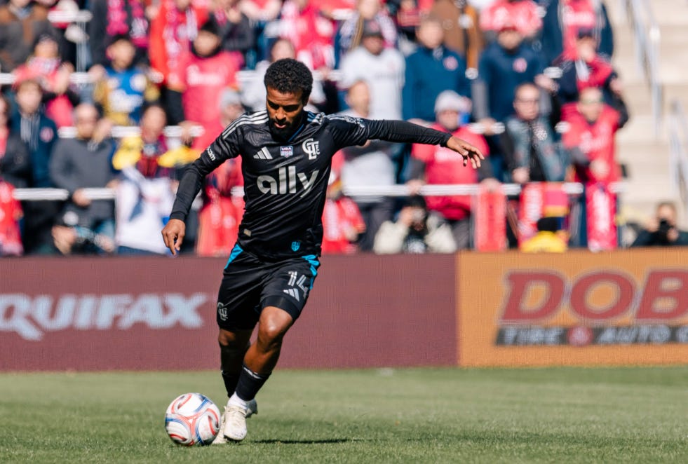 Nathan Byrne driving with the ball last Saturday in St. Louis. (Photo courtesy of Charlotte FC.)