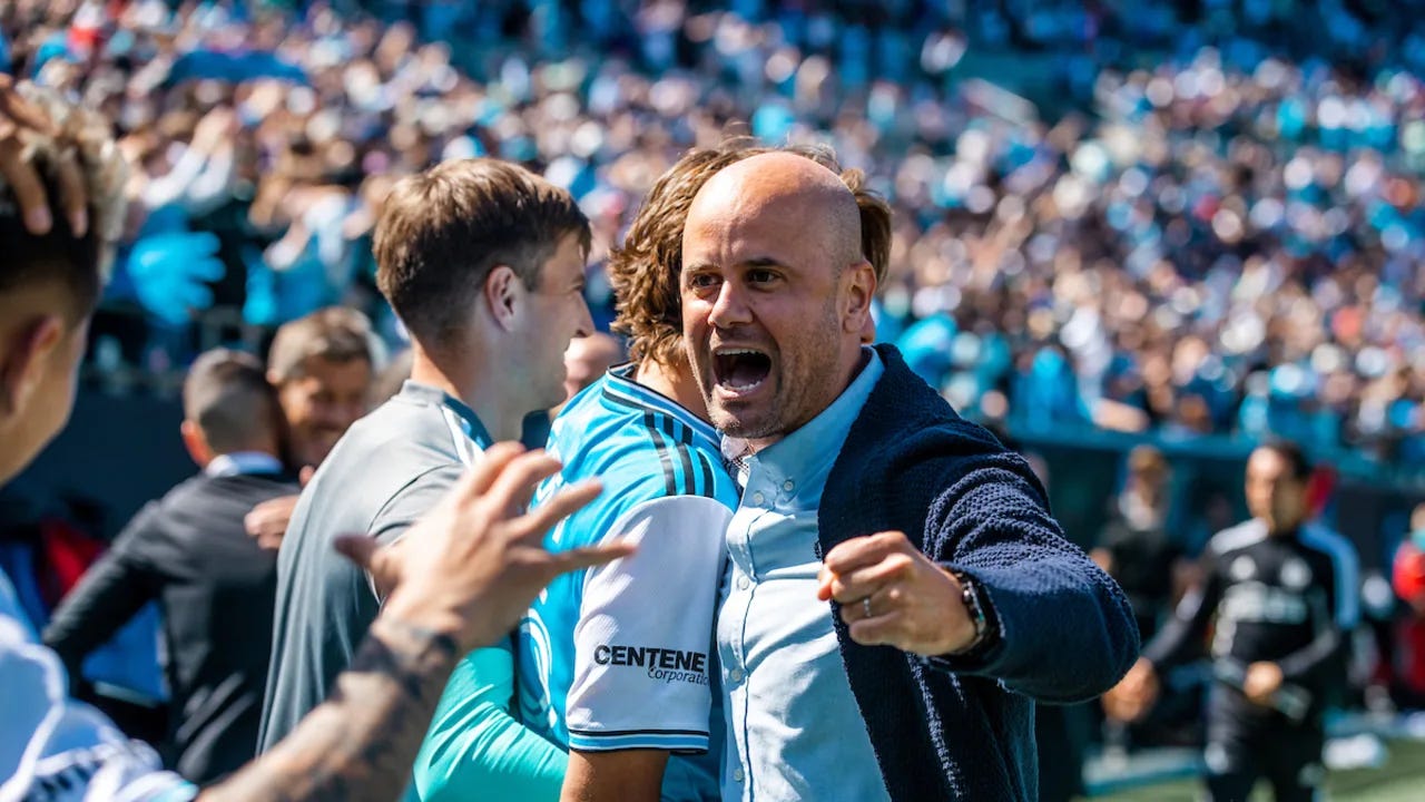 Miguel Angel Ramirez can’t contain his excitement after Charlotte FC wins its third straight at home (Photo courtesy of Charlotte FC.)