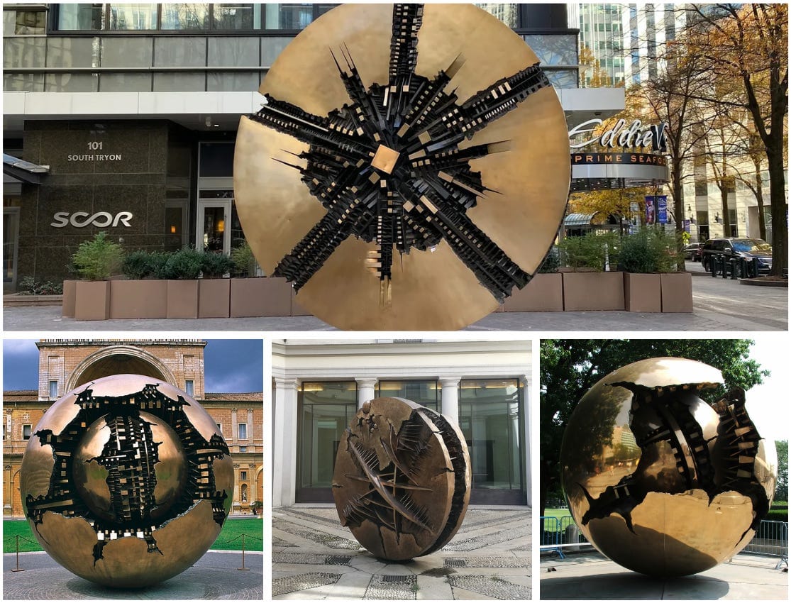 Charlotte’s “Il Grande Disco” uptown (top); with other discs and spheres by Italian artist Arnaldo Pomodoro in (bottom left to right) Rome, Milan and New York City. (Ledger file photo at top, Rome and Milan via Wikimedia Commons, New York via Shutterstock)