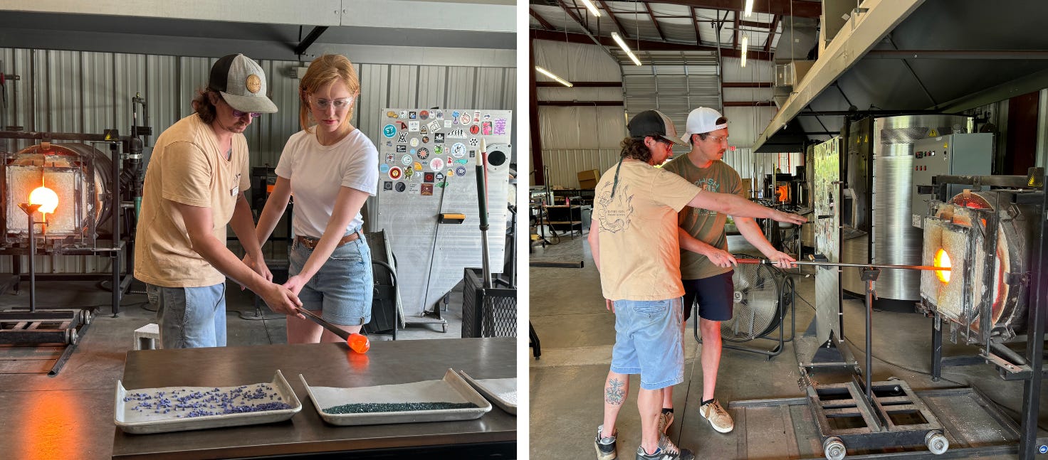 Glassblowing often requires teamwork, especially for beginners. Strunk assisted Pfeifer in helping Jonathan and Sara craft their tumblers.