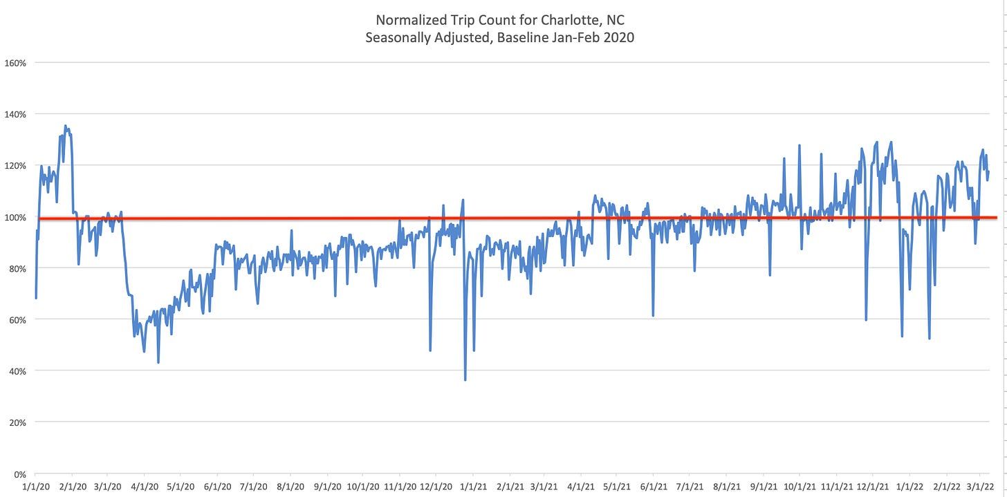 Vehicles back to normal: Meanwhile, the number of automobile trips in Charlotte fully recovered to pre-pandemic levels consistently beginning about August 2021, according to traffic data provider INRIX, which tracks vehicle trips using cell phone data: