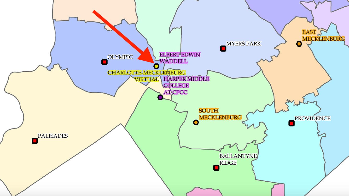 The school, on Nations Ford Road west of I-77, is in the Olympic attendance zone but is close to zones of several other high schools, including Myers Park, South Mecklenburg, Palisades, Ballantyne Ridge and Harding. Drawing attendance zones around Waddell could alter boundaries for some or all of those schools.