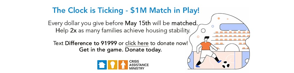 You can help local families achieve housing stability with a donation to Crisis Assistance Ministry, which provides assistance and advocacy for people in financial crisis, helping them move toward self-sufficiency by providing emergency rent and utility assistance as well as basic necessities. Every dollar donated by May 15 will be matched!