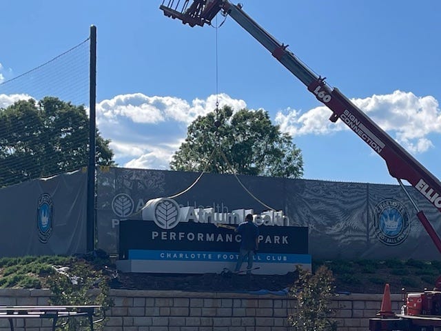 A new Atrium Health Performance Park sign was installed this week. (Photo by Carroll Walton)