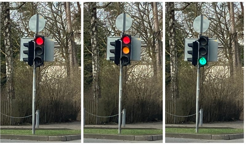 A traffic light in Jūrmala, Latvia: Stop, get ready to go, go.