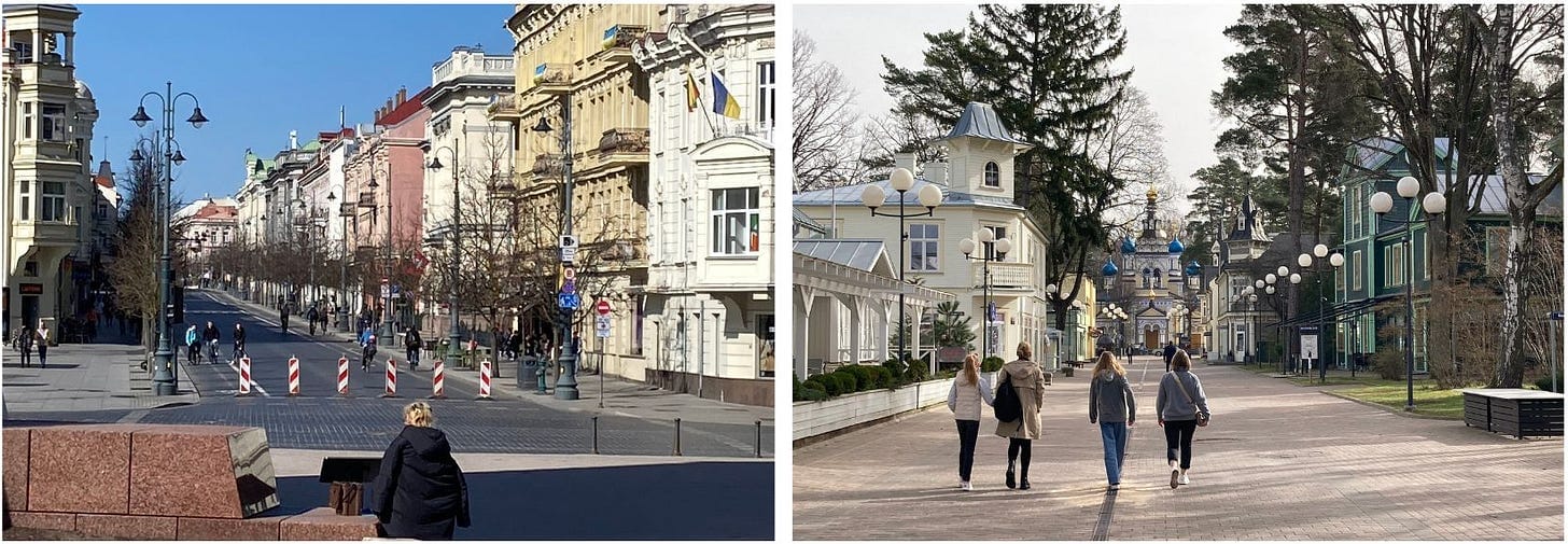 In Vilnius, Lithuania, (left) officials put up temporary traffic barriers, or bollards, to close a road to traffic on a Saturday morning, which encourages biking and walking. In Jūrmala, Latvia, the main drag, Jomas Street, is a pedestrian promenade closed to traffic and lined with shops and restaurants.