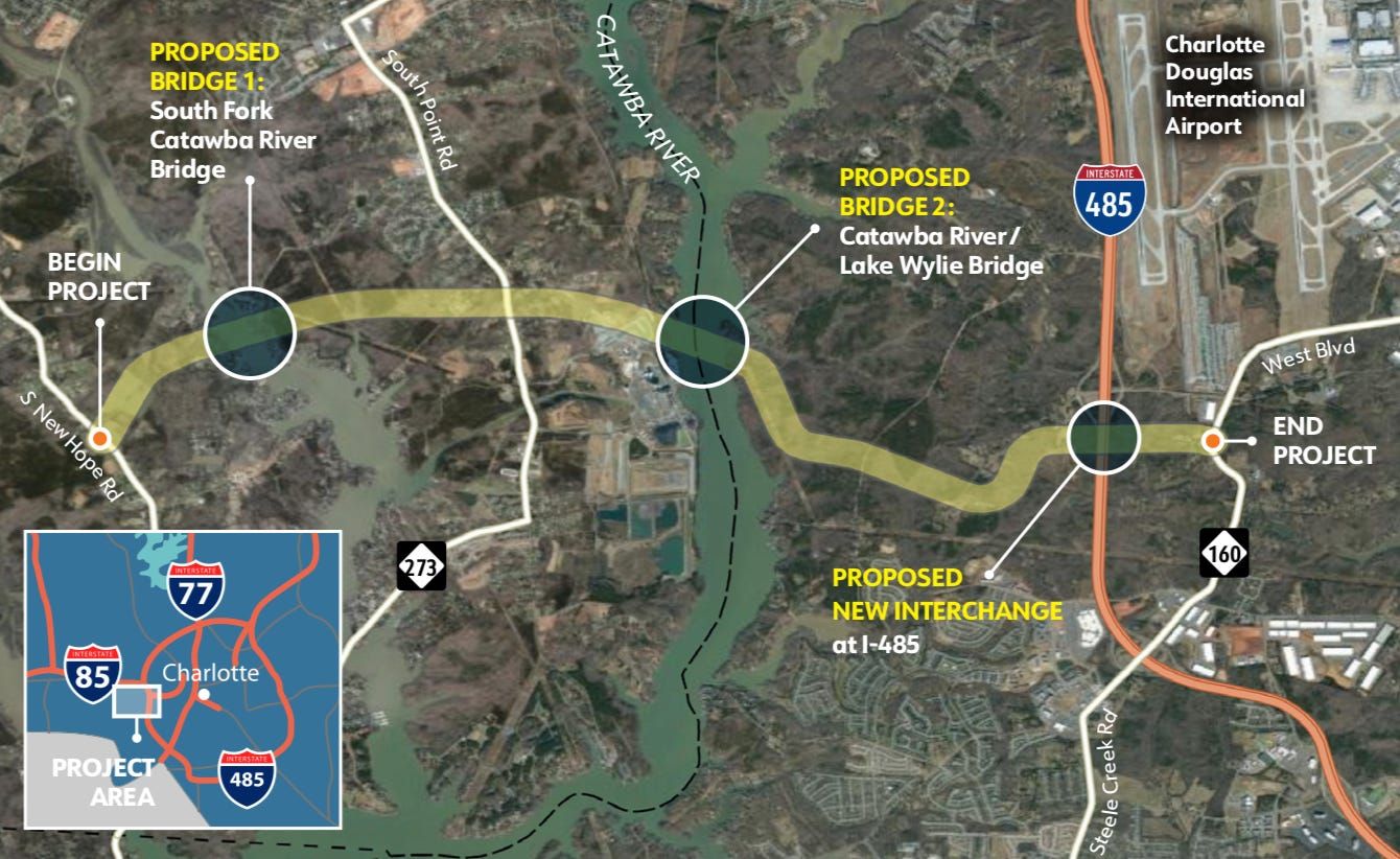 ➡️ What do you think? Should the state build another bridge over the Catawba River and link Charlotte’s airport and I-485 more directly to Gaston County? Drop us an email, or leave your thoughts in the comments: