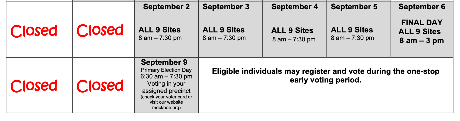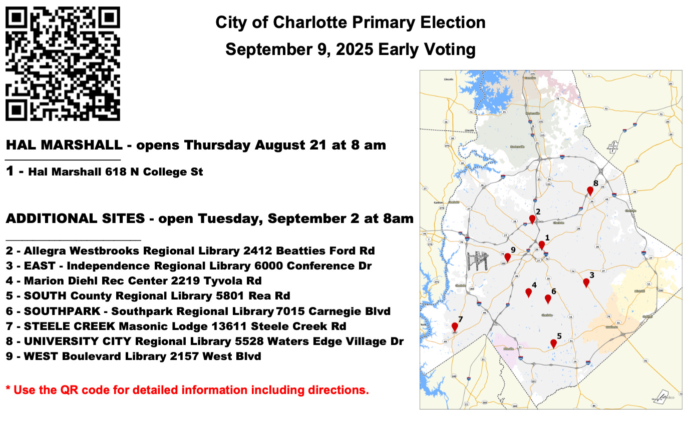 The city of Charlotte primary election is Tuesday, Sept. 9 — You can vote early through Saturday at spots throughout the city