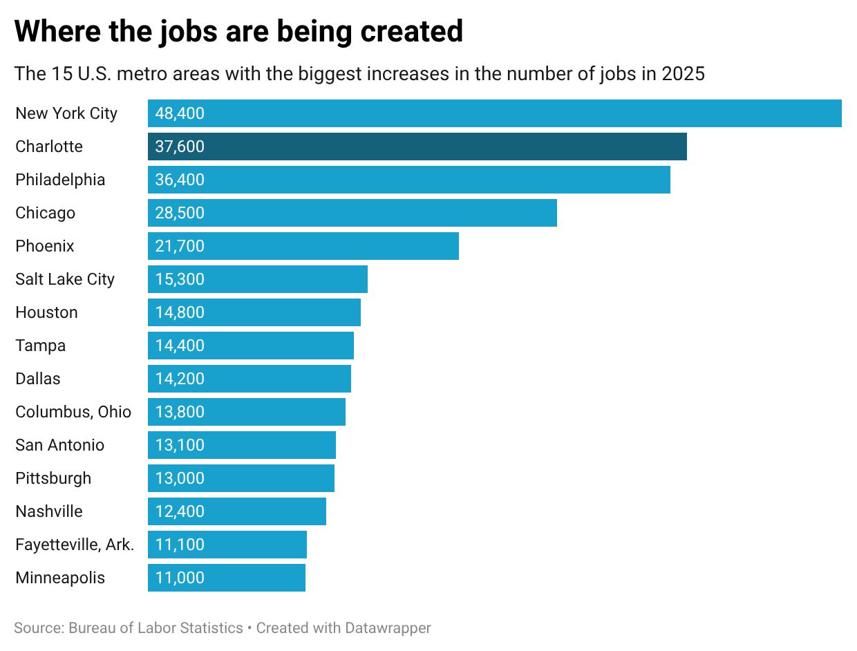 Yet the 37,600 jobs that the Labor Department said were created in the Charlotte region in 2025 were second only to the New York City region, which is seven times the size of Charlotte and added 48,400 jobs. The figures show that the Charlotte region created more jobs in 2025 than 44 states.