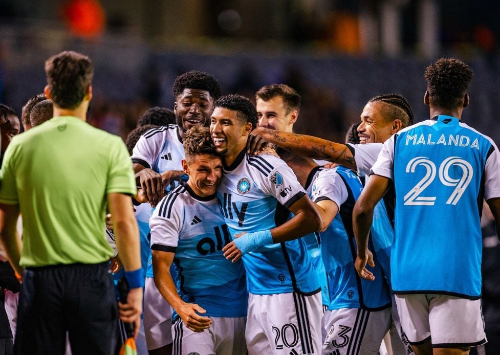 Westwood and teammates celebrate his lone goal against the Chicago Fire. (Photo courtesy of Charlotte FC.)