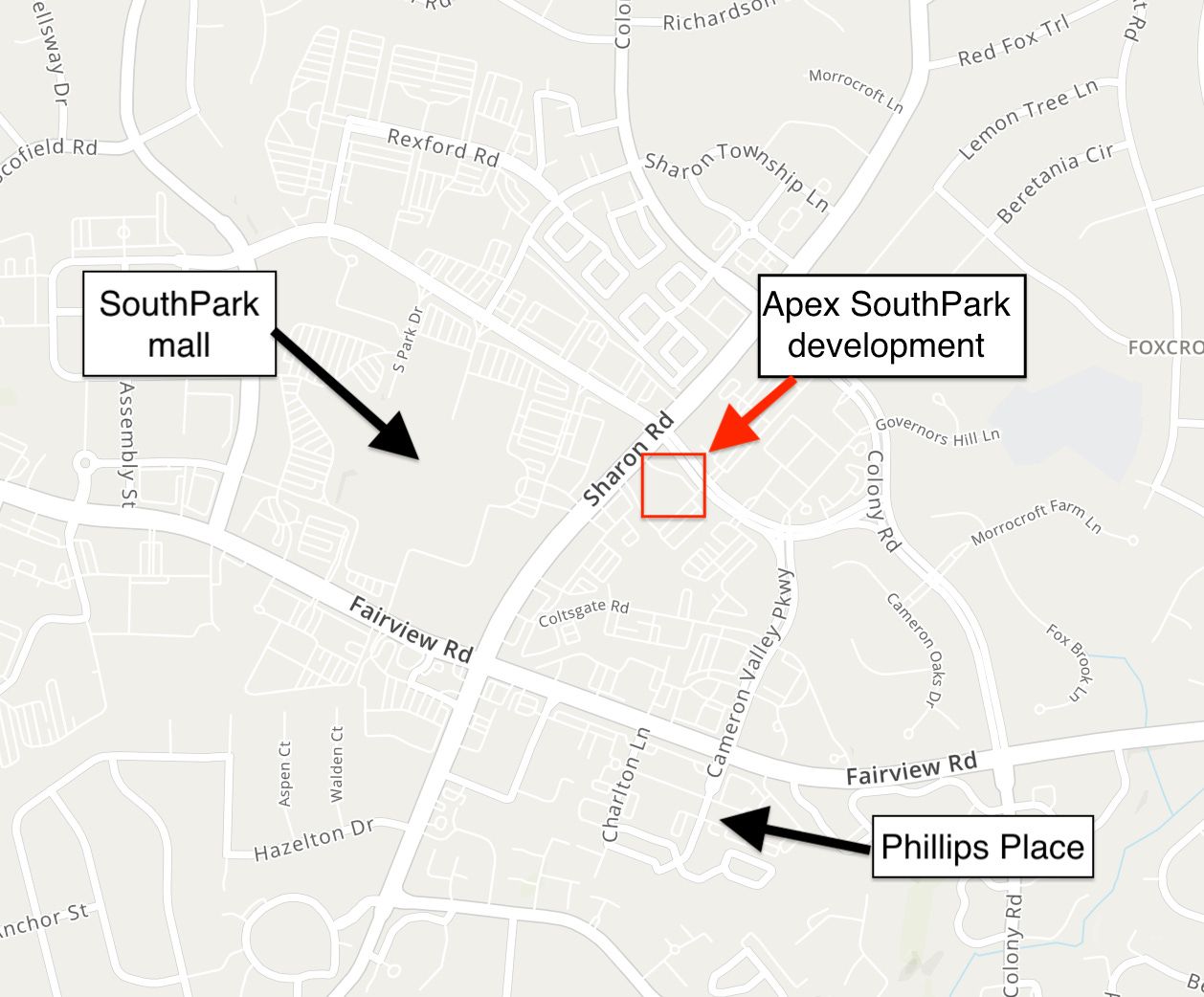 The old Colony apartments have been leveled, to be replaced by apartments and retail. A plan for a 15-story apartment tower on Fairview Road won approval this summer. There are plans for a park behind SouthPark mall — and for a three-mile greenway-like biking and pedestrian trail encircling the area, called “The Loop.”