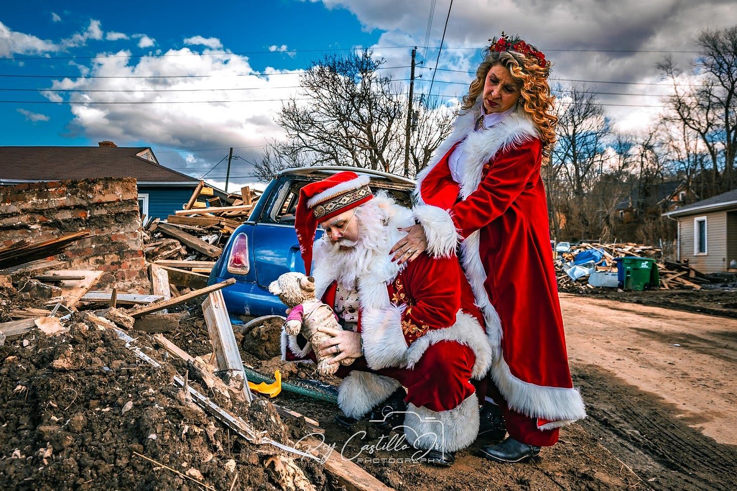 In December, Castillo shared Christmas-themed photos among the rubble in Swannanoa, bringing in nearly 3 million views. The photo series features a poignant Santa Claus and Mrs. Claus posing with Christmas decor washed away by the floods. Castillo said none of the debris was moved or posed for the photos.
