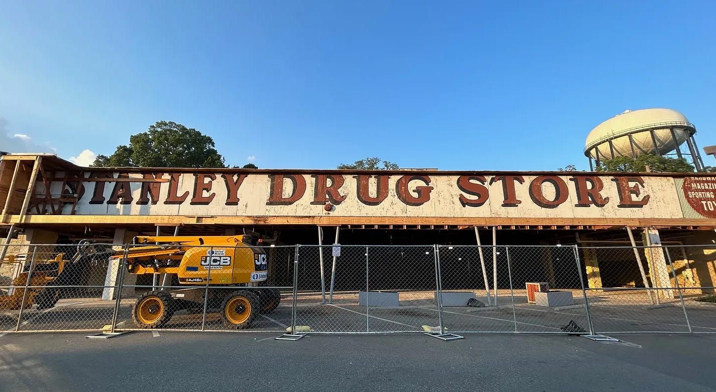 Construction crews pulled the facade off the former Dollar General store on East 7th Street in Elizabeth last week and unearthed a treasure — the front of Stanley Drug Store, which occupied the building from 1934 to 1997. An article in the Charlotte Observer published when the building was sold in 1997 said Stanley Drug had offered an unusual mix of services, including a pharmacy, a lunch counter and a shoe department. Now, the property is being renovated again into a new retail center called Shops on 7th. (Photo by Christopher Lawing/Charlotte Signs Project)