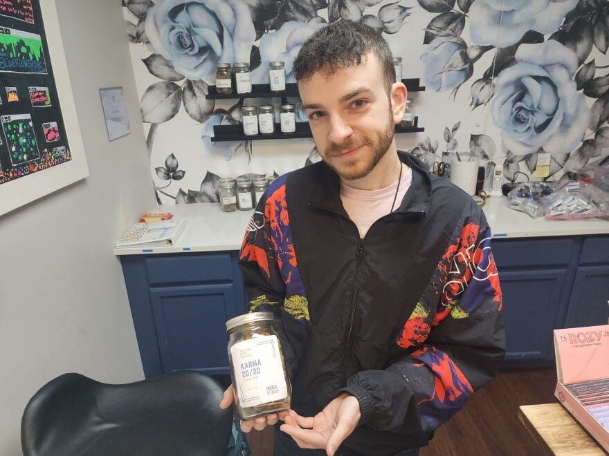 Nick Davenport, who works at Blue Flowers in SouthPark, displays a jar of “Karma 20/20” hemp flower. He says customers are surprised they can “get this kind of stuff” in North Carolina. (Photo by Steve Harrison/WFAE)