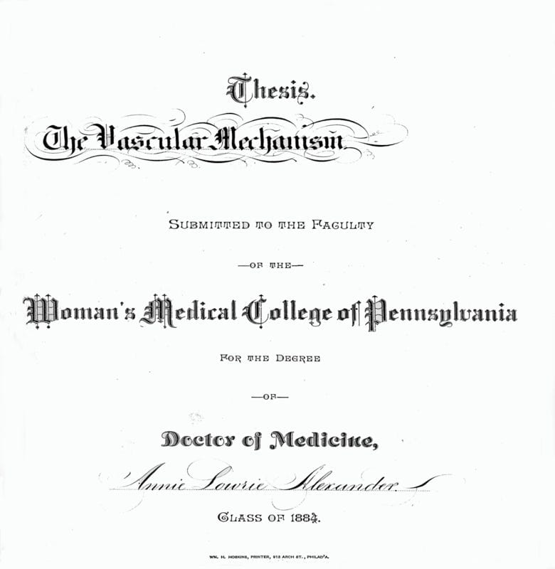 Ultimately, the extreme helicopter parenting worked, and Annie moved to Philadelphia in 1882 at the age of 17 to study medicine at the Women’s Medical College. Despite the name, Annie and her classmates would endure harassment by male students at the neighboring medical school, who viewed their coeducational counterparts as unladylike and even perverse for pursuing such a career. Annie persisted and graduated in 1884 after studying obstetrics and writing her thesis on “The Vascular Mechanism”: