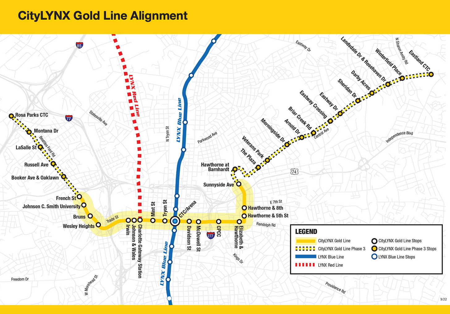 The Gold Line streetcar, which started service in 2015 and was extended in 2021, is an east-to-west line that cuts through uptown, running from Sunnyside Avenue in Elizabeth to French Street in west Charlotte. The city’s transit plan calls for a third phase that would extend the line down Central Avenue to Eastland Yards and, on the other end, up Beatties Ford Road to Rosa Parks Place. The expansion would add six miles and up to an additional 17 stops, according to the city’s website.