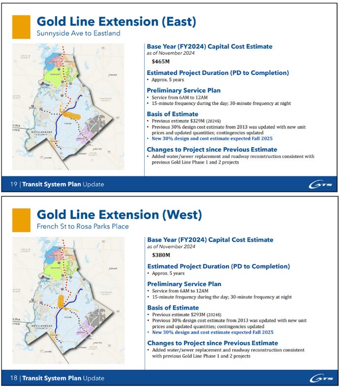 Extending the Gold Line to the east and west would cost an estimated $845 million, according to a CATS presentation in January. That’s less than the construction of the Silver Line and Red Line. (CATS presentation)
