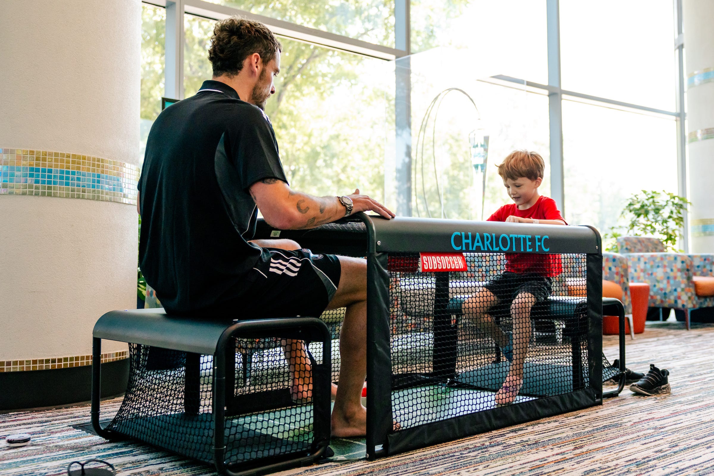 Harry Toffolo (left) playing a game of “Subsoccer” during a recent visit to Atrium Health Levine Children’s Hospital. (Photo courtesy of Charlotte FC.)