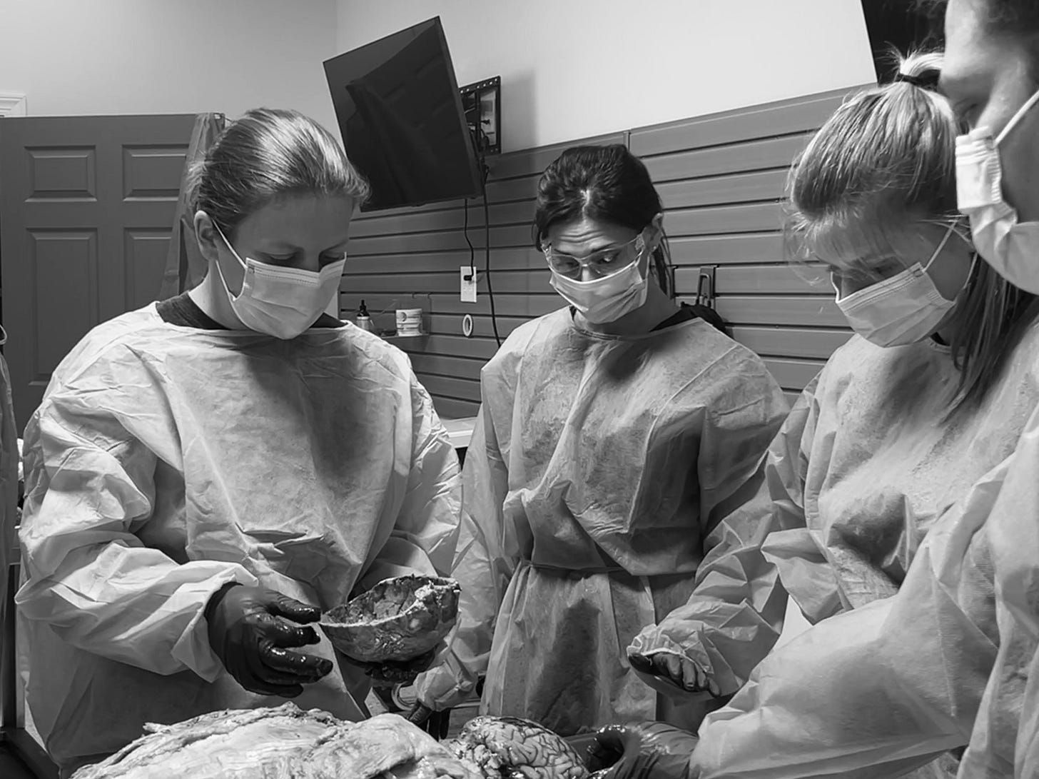 The class reviewed a short medical history of each donor, and then Moore demonstrated how to carefully dissect layers of skin, fat and muscle using a scalpel and forceps.