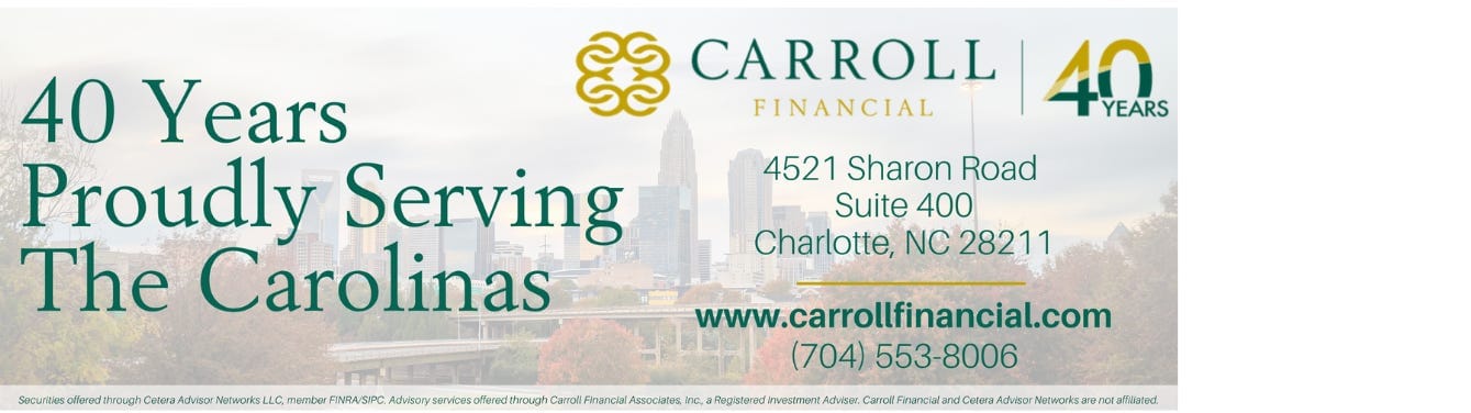 Today’s Charlotte Ledger is sponsored by Carroll Financial, one of the Charlotte region’s oldest and largest family-owned, independent financial planning and investment management firms:
