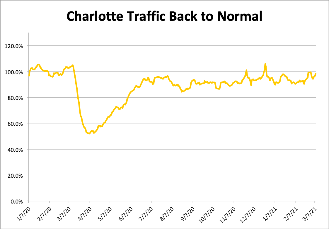 Since Feb. 20, Charlotte traffic has been slightly above the pre-pandemic baseline more than half the time.