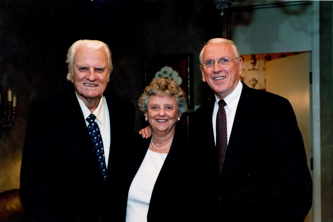 In this family photo, Jean Ford stands between her brother, the late Billy Graham (left), and husband Leighton Ford. (Photo courtesy of Leighton Ford Ministries)
