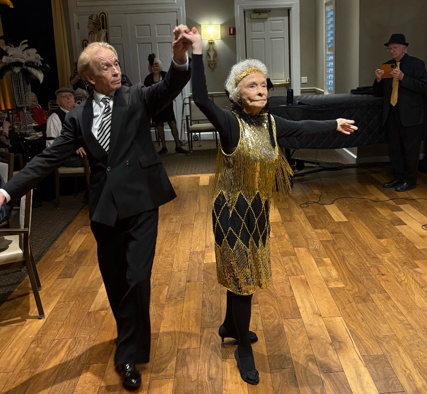 Nita, as everyone calls her, danced with her instructor at her recent Roaring 20s birthday party. She wore a sequined flapper dress from way back when. Nita also drives, though only short distances on the campus of the Charlotte senior community where she lives independently. Her ride is a Jaguar. Nita is 105.