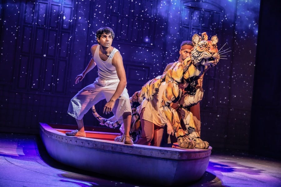 Taha Mandviwala stars as Pi Patel in the Tony-winning “Life of Pi,” sharing a lifeboat journey with a Bengal tiger puppet operated by three performers. (Photo courtesy of Blumenthal Arts)